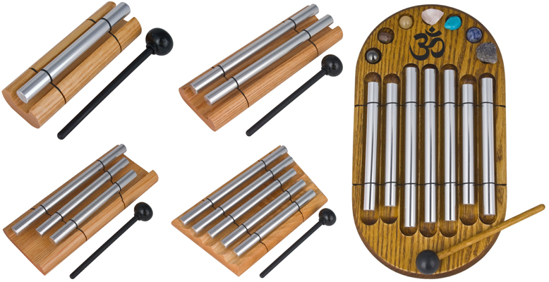 Zenergy Chimes are available in one, two, three and five bar models, and also a seven bar Chakra Zenergy Chime with matching semi precious stones (click on the small image above to see the full range [not to scale] in the larger image). Each Zenergy Chime includes a mallet and a keyhole slot on the back of the wooden base that enables the Zenergy Chimes to be installed upright on a door or wall. The mallet handle slips in between the chime and the wooden base for safekeeping. An example of a Zenergy Chime being played can be viewd here.