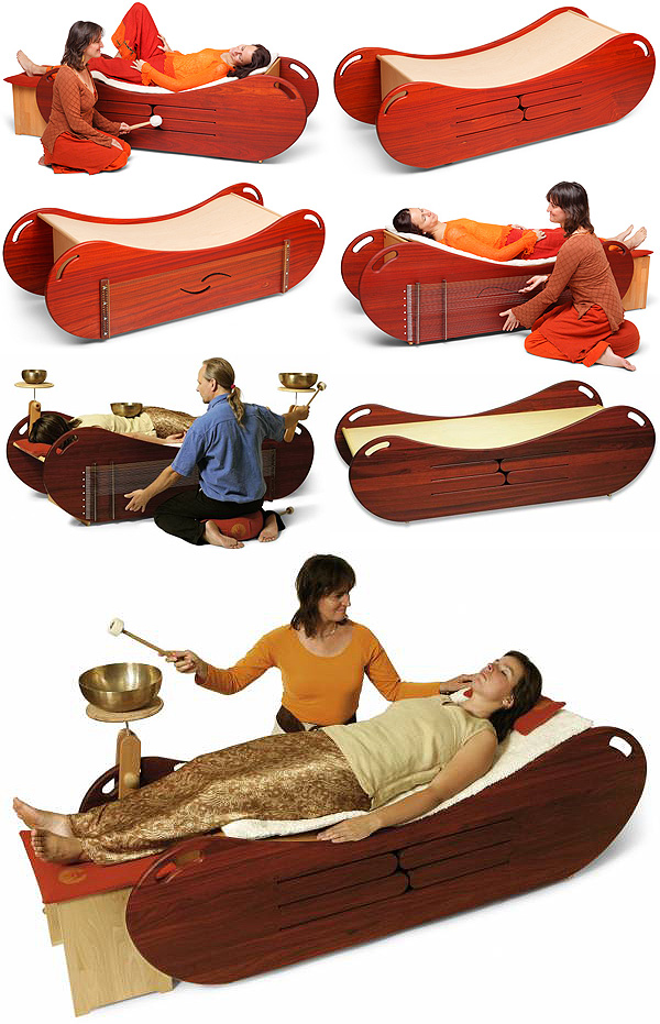 The soundwave is an ingenious combination of two instruments built into a comfortable platform which the recipient of the sound therapy experience lies upon. On one side is a large and sonorous tongue drum (grounding, rhythmic, integration, structure). The notes of the with four wooden tongues are A, B, D and E.